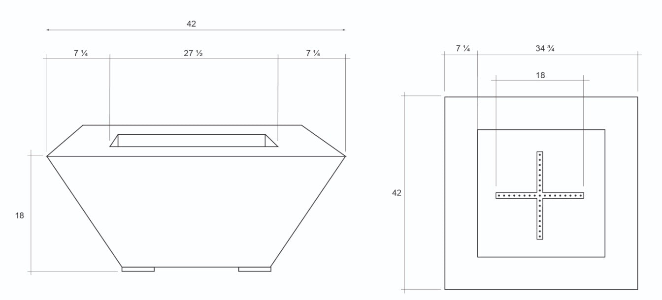 - Width/Length: 40", Height: 18", Ledge Width: 6", Burner Plate: 34", “Cross” Burner: 18", Weight: 280 lbs.