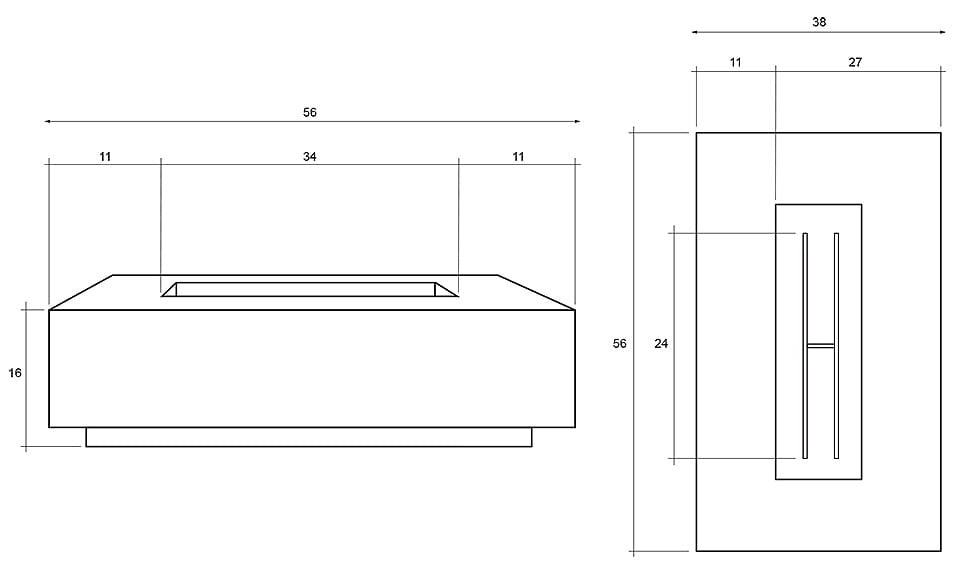 - Length: 56", Width: 38", Height: 16", Edge Width: 11"/16", Burner Plate: 34" x 16", “H” Burner: 24" x 5", Weight: 360 lbs.