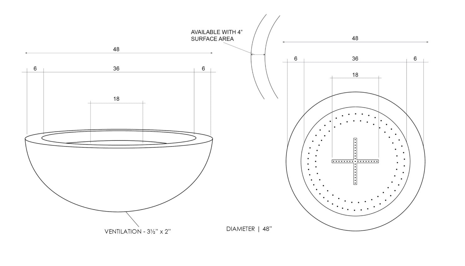 • Top Diameter: 48", Bottom Diameter: 24", Height: 17", Burner Plate: 40", “Cross” Burner: 18", Weight: 300 lbs.