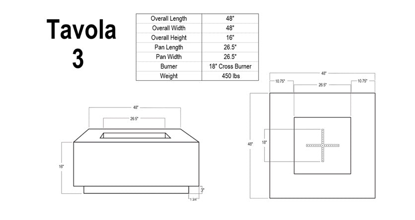 The Prism Hardscapes 48" x 48" Tavola 3 Fire Table is a square fire pit of modern, clean lines that has enough size to boast a 12"-wide edge, offering enough table surface to hold plates and glasses for an evening of food and cocktails with family and friends.